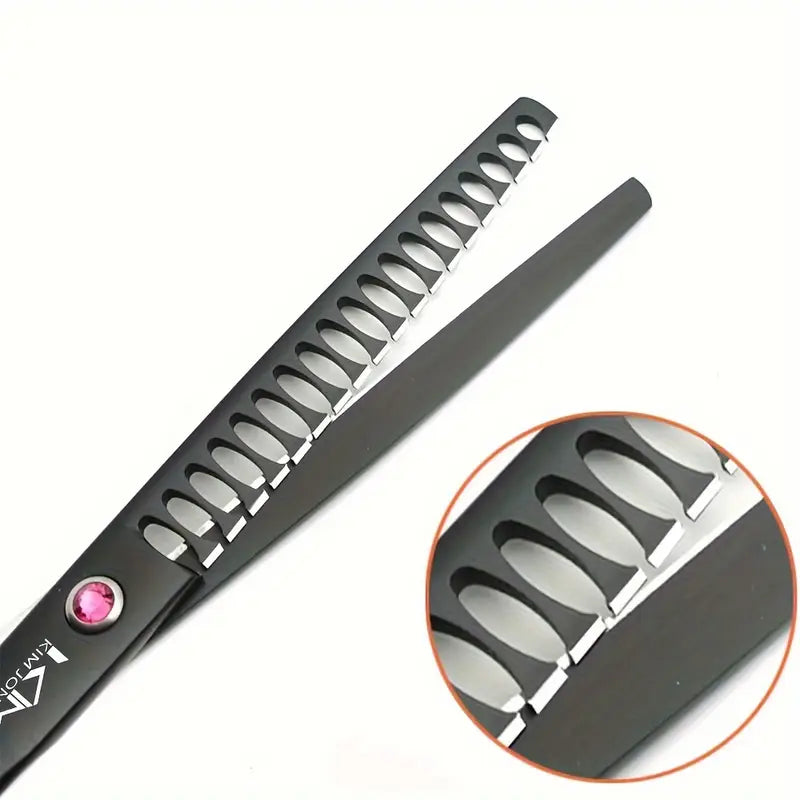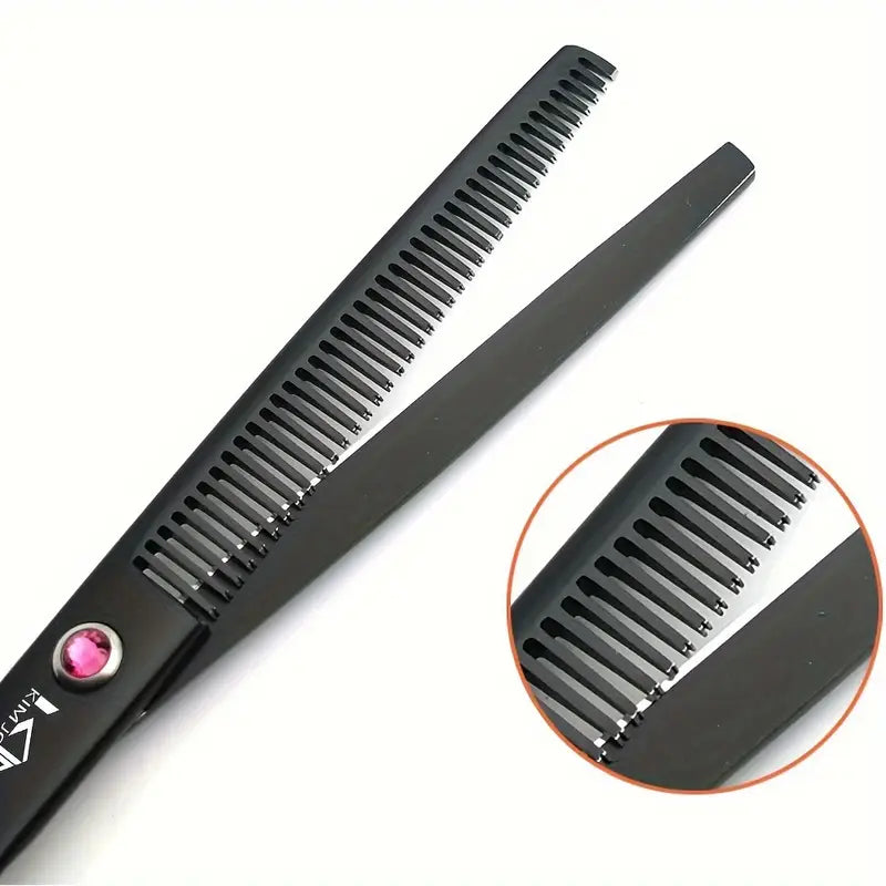 Gemaakt van 6CR roestvrij staal, staan deze scharen bekend om hun hoge hardheid en duurzaamheid. Dankzij zorgvuldig polijsten en slijpen in maar liefst 40 productiestappen blijven de scharen langdurig scherp. De rechte en gebogen scharen hebben een perfecte snijhoek van 25°-30°, ideaal voor nauwkeurig en comfortabel trimmen. De dunner wordende scharen zijn speciaal ontworpen met een scherpe tandpunt die het haar netjes dunner maakt zonder te trekken.